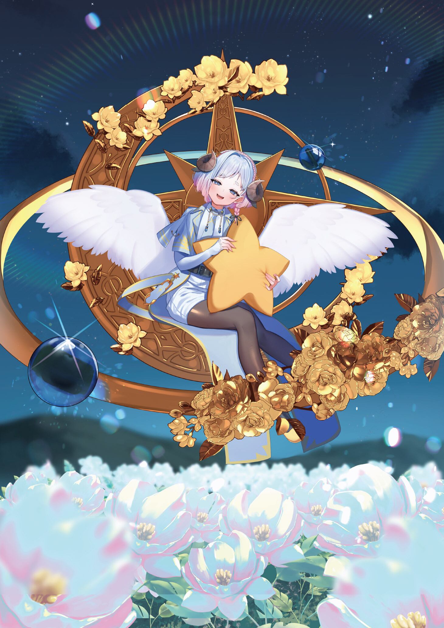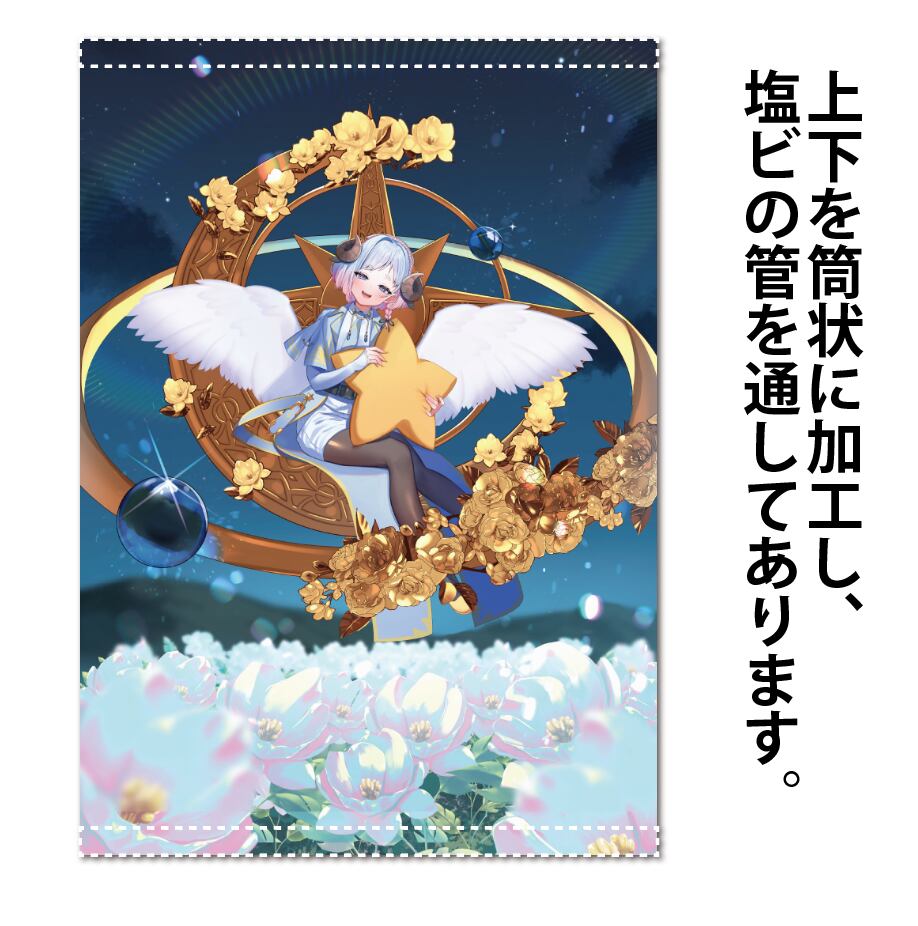 Vtuberちむが月に座っているタペストリーです。